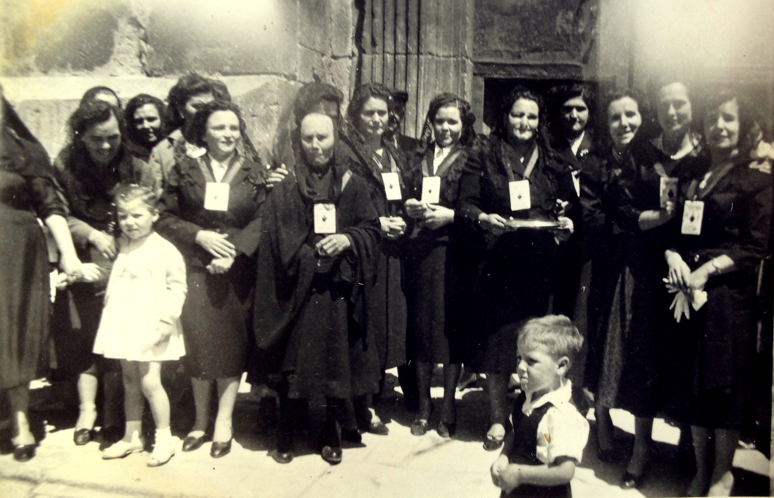 Durant les dècades dels anys 50, 60 i 70 se celebrava la festa del Cor de Jesús el divendres posterior al segon diumenge de Pentecosta. Al juny, per tant. Aquestes imatges, en canvi, són del 15 d’agost. En tot cas, les dones eren les protagonistes, cada any un grupet diferent. Anaven al forn a elaborar dolços: rotllets i cascaranyes per al dia de la festa grossa, contractaven un dolçainer i un tabalet que arribaven al poble amb l’autobús de línia, i se compraven un vestit negre nou. Per al Ball Rodat cada una de les festeres convidava 2 parelles de balladors i balladores que dansaven en el seu nom i ocupaven els primers llocs -per ordre rigorós- al costat  dels  músics, després s’afegien a la renglera tots els que volien ballar. La festa sempre començava en una missa, i a l’eixida unes dretes i les altres assentadetes en catrets, però totes en mantellina i escapulari, miraven la retratista amb submissió. se done1958. Arxiu de Vistabella del Maestrat. Fons familiar Paquita Miravet Olaria.