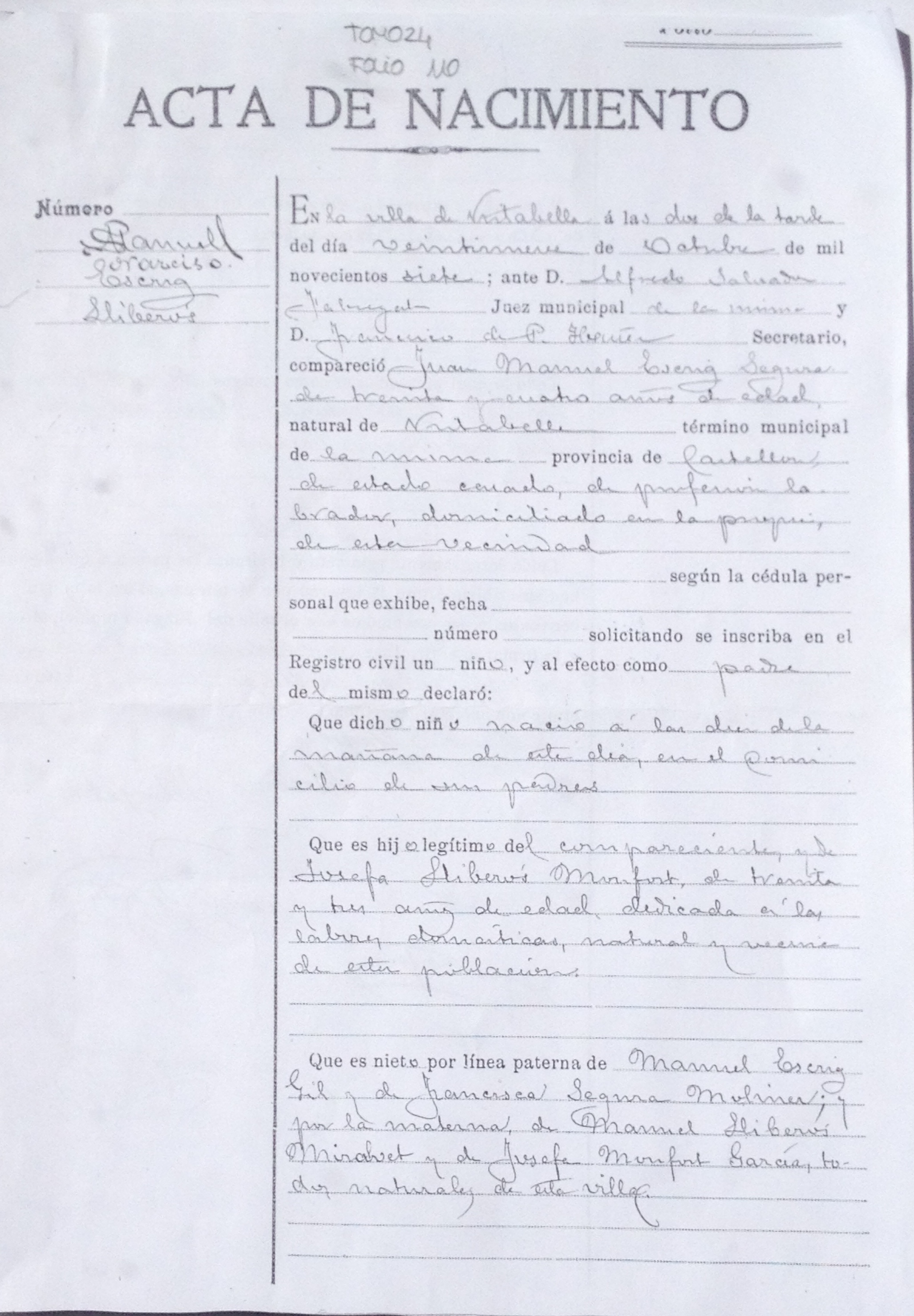 Va néixer a Vistabella a les 2 de la vesprada el 29 d’octubre de 1907. Era el segon fill de Juan Manuel Escrig i Josefa Lliberós, i encara que el secretari es va equivocar i el va inscriure com a Manuel, després d’afegir una gran S per damunt la M, li van posar Samuel de primer nom i Narciso -el sant del dia- de segon.