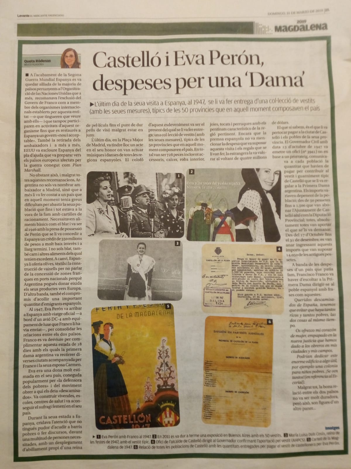La investigadora Queta Ródenas va publicar el 31 de març a Levante: Castelló i Eva Perón, despeses per a una “Dama”, un extens article on detallava el preu dels 50 vestits regionals complets (roba, calcer, joies, complements) que Franco li va regalar a la dona del president argentí quan va vindre en viatge oficial el 1947. Antonio Giner, en el seu article del programa de les festes de Vistabella 2018, ja havia localitzat aquest regal dins les Actes Municipals.