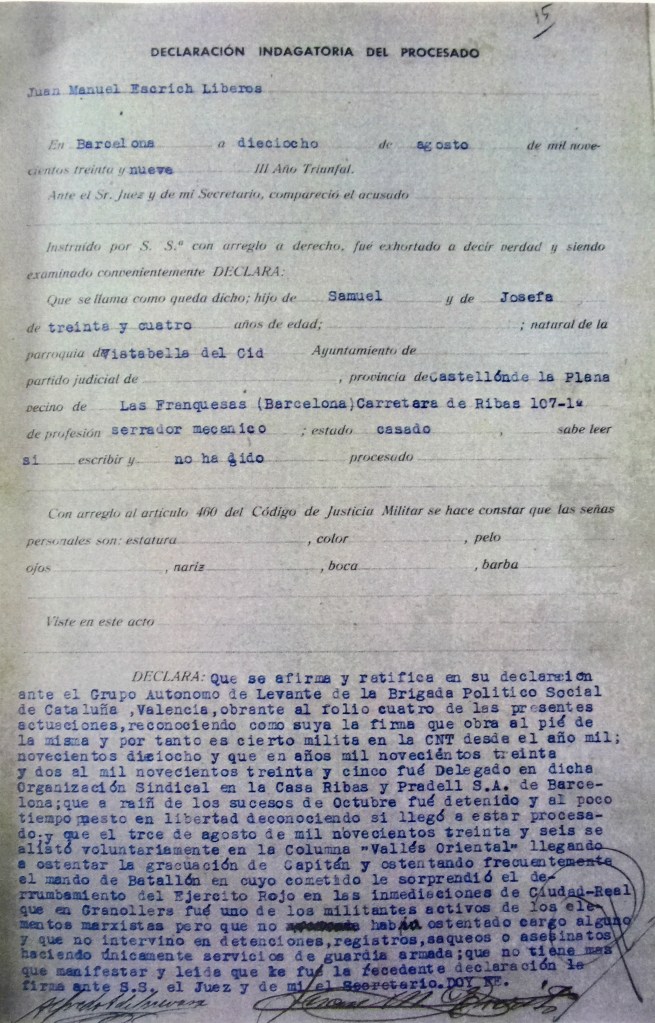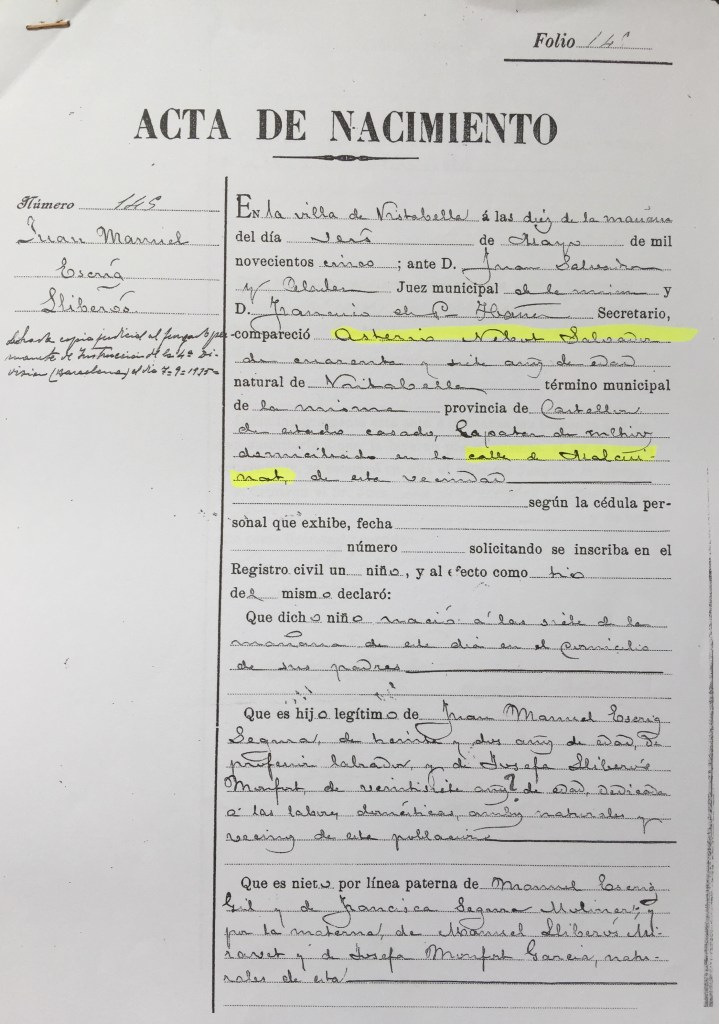 Juan Manuel Escrig Lliberós va nàixer a Vistabella del Maestrat el 6 de maig de 1905, segons consta al foli 145 de les Actes de naixement del nostre arxiu. Era el primer fill de Samuel Escrig Segura i de Josefa Lliberós Monfort. Quan tenia uns tres anys la família es va traslladar a viure a Catalunya, a Les Franqueses del Vallès, prop de Granollers.