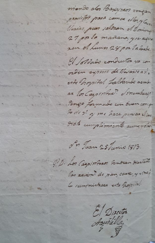 P.D. Los carpinteros tendrÔn diariamente las raciones de pan, carne, y vino que le suministrarÔ este hospital.