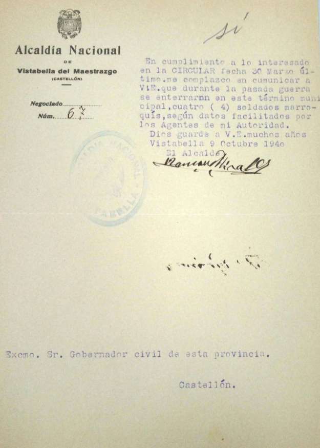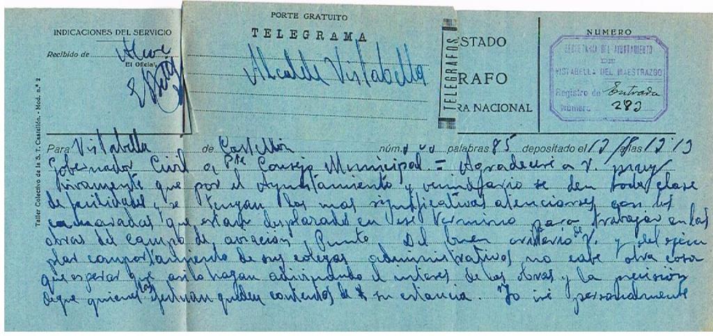 El ayto. remite documento firmado por los propietarios afectados con cesión gratuita de los terrenos […] Las obras comenzaron pero se debieron paralizar ya que en 1936 la Comisión Gestora municipal designó una comisión para pedir a las autoridades de Castelló la continuación de las obras, como quedó reflejado en el acta del pleno del 31 de mayo.