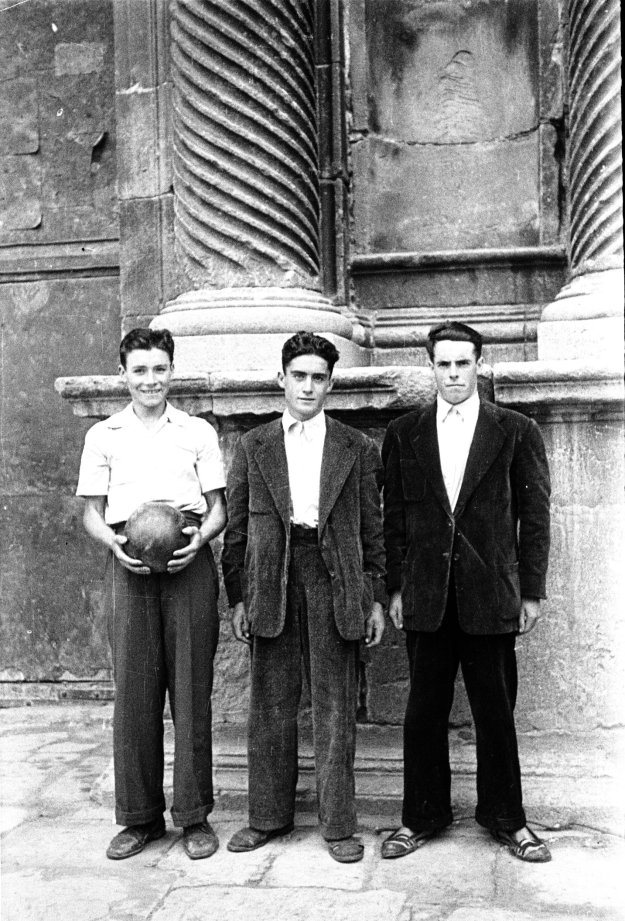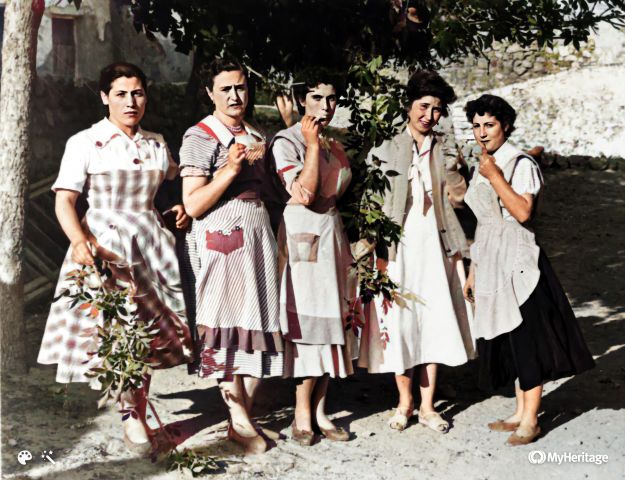 Un diumenge de matí la mestra i les alumnes d’escola, tocades en mantellines, es fan una foto a l’eixir de missa.